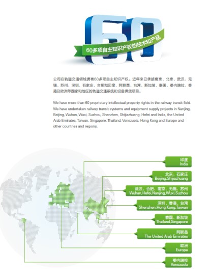 公司在轨道交通领域拥有60多项自主知识产权。近年来已承接南京、北京、武汉、成都、无锡、苏州、深圳、石家庄、合肥和印度、阿联酋、台湾、新加坡、泰国、委内瑞拉、香港及欧洲等国家和地区的轨道交通系统和设备供货项目。